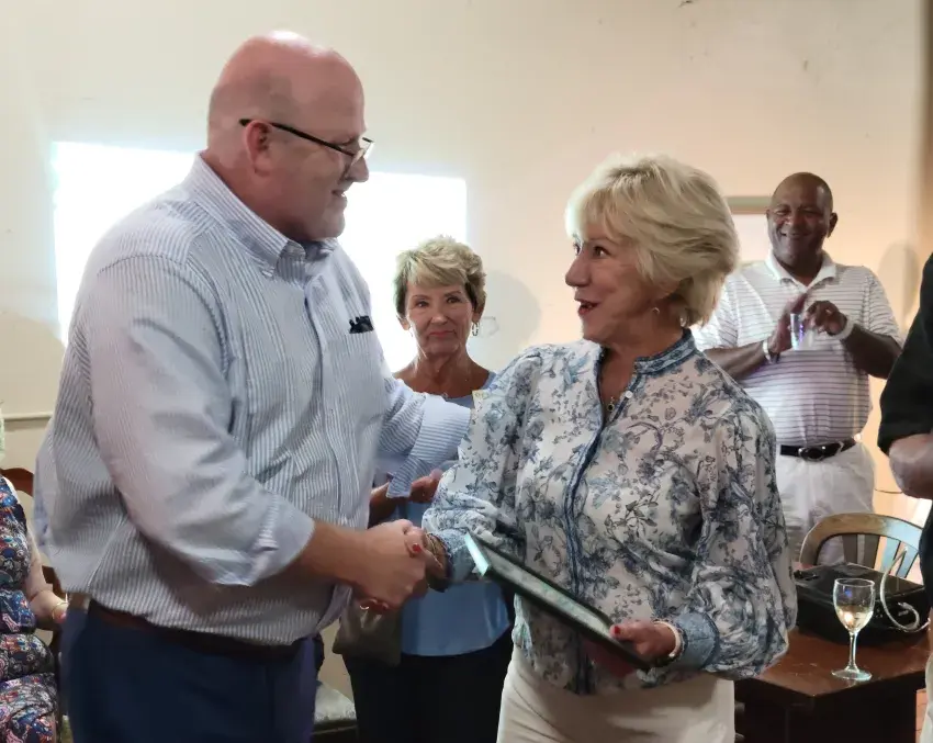 Greenwood-Leflore County Chamber of Commerce President Miller Arant, left, presents Pam Powers with a certificate acknowledging the new location of Powers Properties on 109 W. Market St. The ribbon-cutting celebration was held Wednesday. In the back row from left are Chamber Ambassador Betty Aden and Greenwood City Council President Ronnie Stevenson. (By Kevin Edwards, Copyright 2024 Emmerich Newspapers, Inc.)