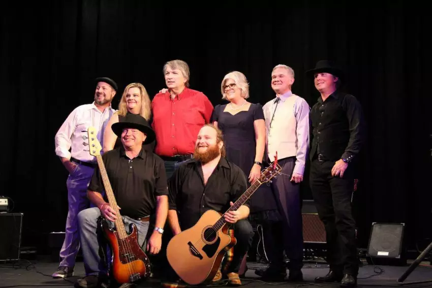 Members of the “Ring of Fire” band and a few of the vocalists are, kneeling, from left, Paul Baker, bass player; and Taylor Buchanan, guitar and vocalist; standing, Chris Sudduth, drums; Freda MacIntosh, Ted MacIntosh, Rhonda Drummond and Lee Makamson, all vocalists; and Alan Jones, guitar and vocalist.