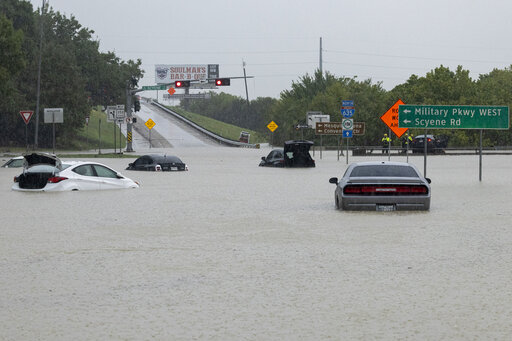 DALLAS (AP) — Heavy rains across the drought-stricken Dallas-Fort Worth area on Monday caused streets to flood, submerging vehicles as officials warned motorists to stay off the roads and water seeped into some homes and businesses.