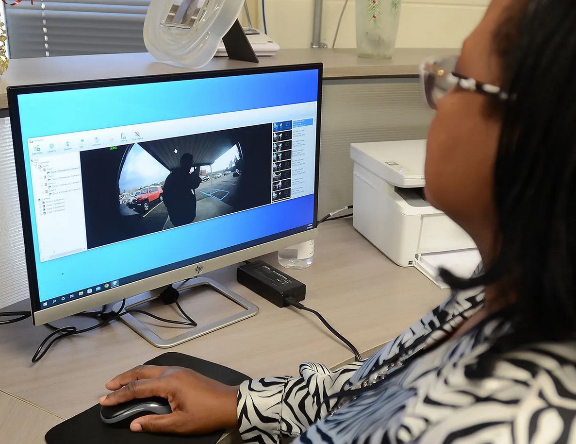 In Covington County, a federal grant allowed the district to install an access control system, which placed keycard locks on exterior doors, and cameras similar to Ring doorbells that secretaries can use to buzz in parents. Only staff have the keycards to open exterior doors from the outside, but a motion sensor on the inside of the door unlocks it for any person exiting.