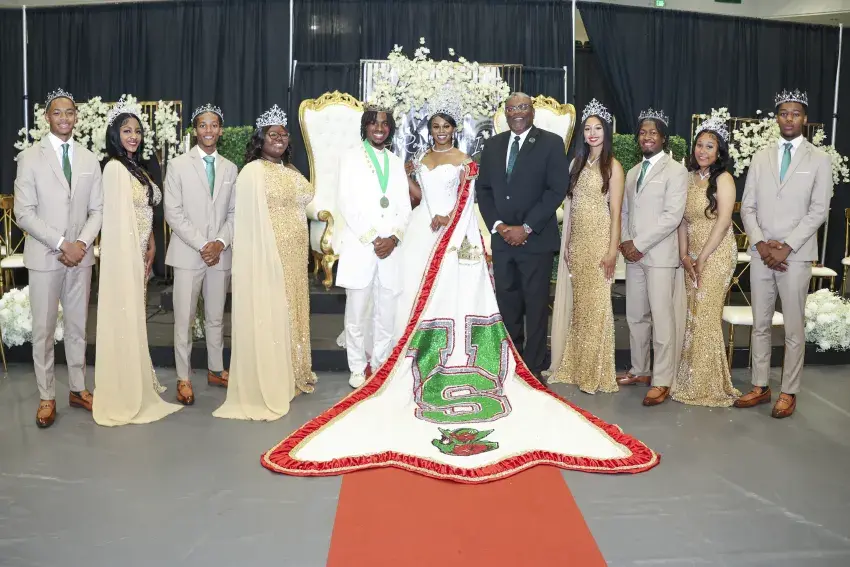 From left are Mr. Sophomore Henry Espy and Miss Sophomore Destyni Gipson, Mr. Junior Jarbari Johnson and Miss Junior Myiesha Smith, King Jon-Michael Frazier and Queen Kristina Williams, MVSU President Dr. Jerryl Briggs, Miss Senior Jade Smith, Mr. Senior Jovani Johnson, Miss Freshman Tenaya Collins and Mr. Freshman Joshua Gordon. (By Andy Lo, Copyright 2024 Emmerich Newspapers, Inc)