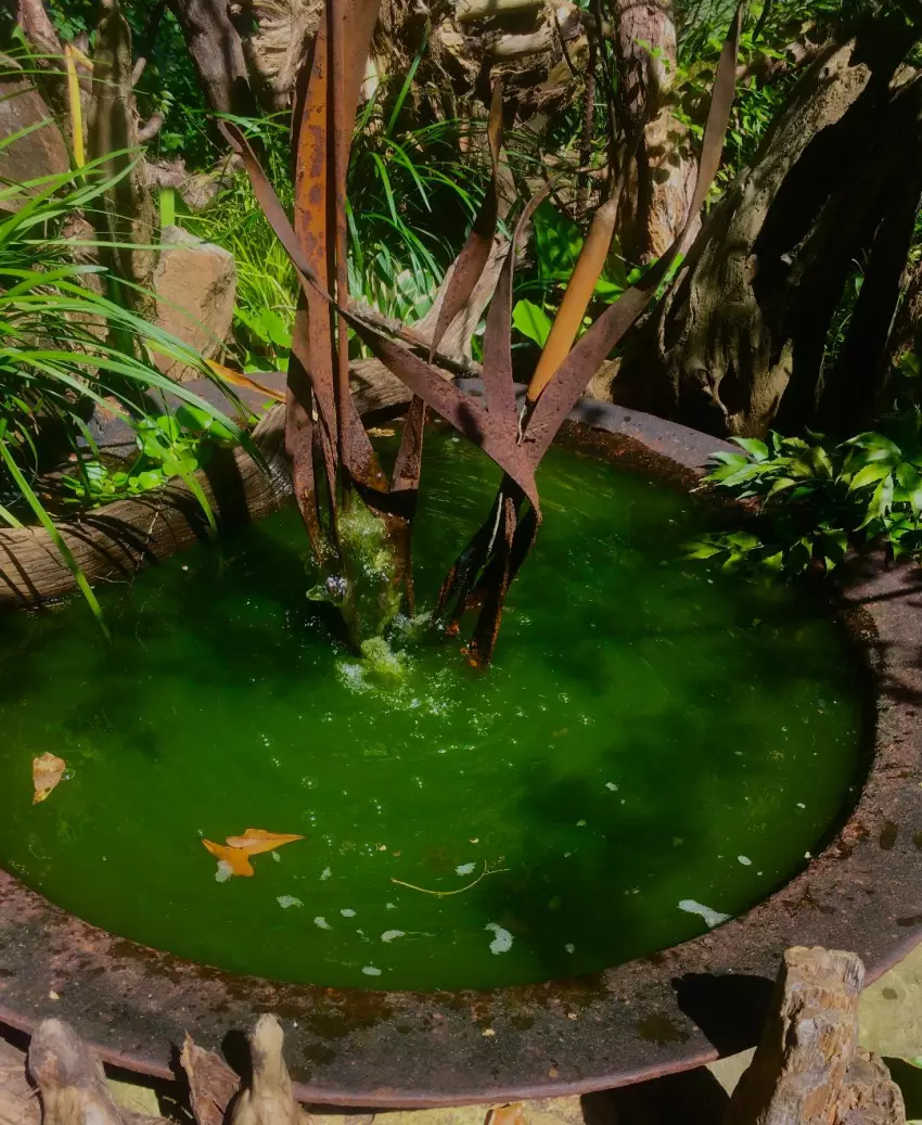 I recently set up another water feature beside a backyard deck where I spend a lot of time staring into a fire, even on warm evenings. It was easy, just a smaller iron cooking kettle with a water pump and fountain to make splashy sounds closer to where I sit. Because it’s in the shade, there’s no algae, and the moving water from the fountain prevents mosquito larvae.