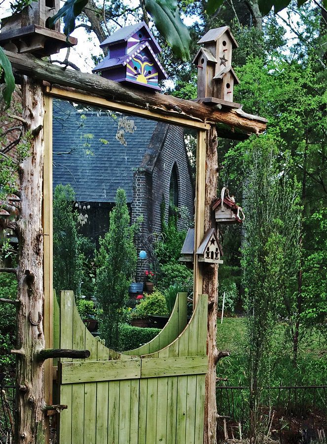 I doubled the color of my tiny garden by hanging large mirrors on the back of my house. Problem is, birds kept banging into them, so I suspended crape myrtle branches a few inches away. It works well, and I see two birds for every one that perches there. This week an aggressive male redbird has been protecting his space by pecking at his reflection.