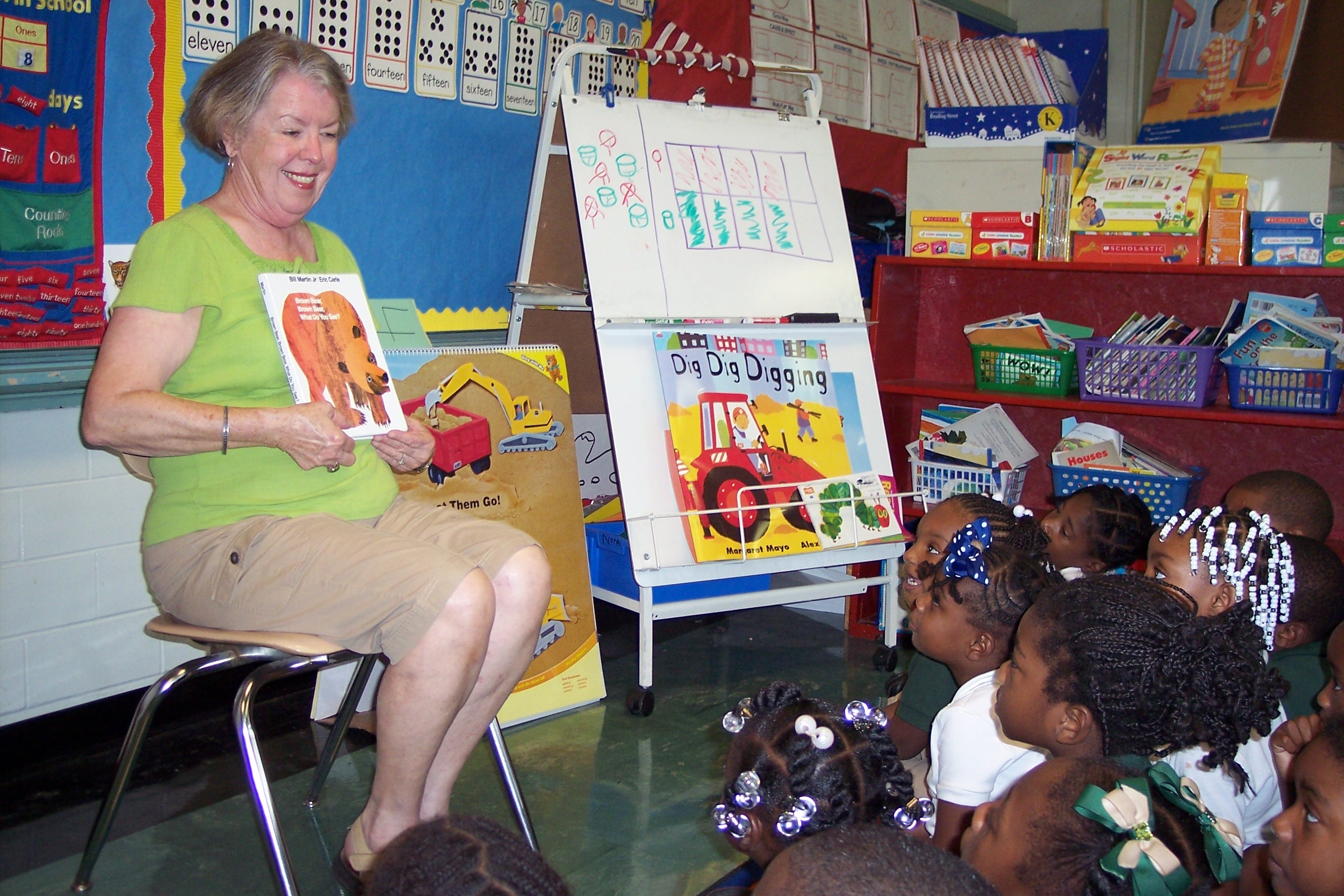 Volunteer readers go to the library at the Extension Office once a month to select and check out story books. The books are library quality, and many are award winners.