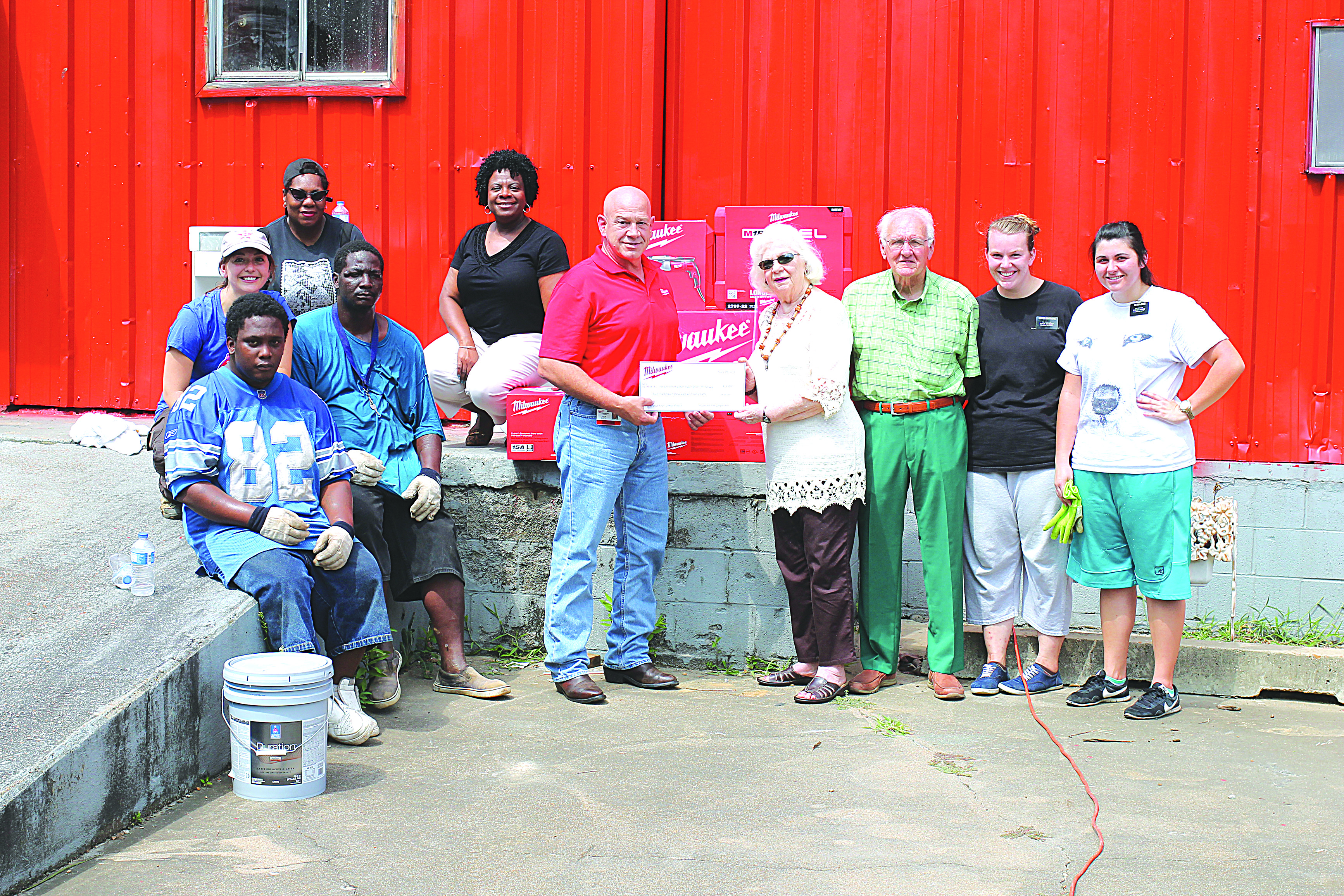 Bryn StoleIn 2014, Jack Bilotta, the Greenwood plant manager for the Milwaukee Electric Tool Company, presented Elizabeth “Pann” Powers of the Greenwood-Leflore Fuller Center for Housing with a $2,000 check and a stack of power tools. From left are volunteer Jim C. Powell; Emily Roush-Elliott; Baptist Town residents Alice Leflore and Daniel Willingham; Greenwood-Leflore Carroll Economic Development Foundation Executive Director Angela Curry; Bilotta; Powers and her husband, Robert “Rocky” Powers, also of the Fuller Center; and Mormon missionaries Sister Whitmore and Sister Jones. The late Pann Powers will be honored at the Greenwood-Leflore County Chamber of Commerce’s Annual Meeting and inducted into the Leflore County Hall of Fame.
