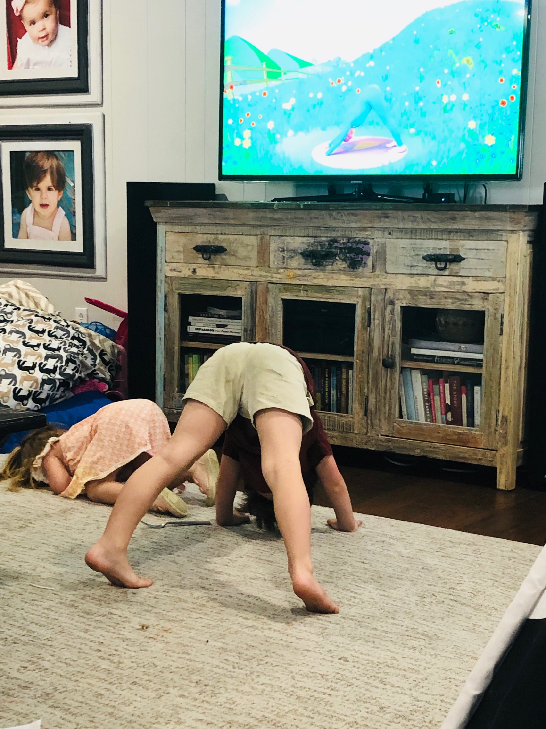 While school is out, Sellers Hackleman, left, and her older brother, Townes, do yoga with a children’s YouTube yoga video on the TV.