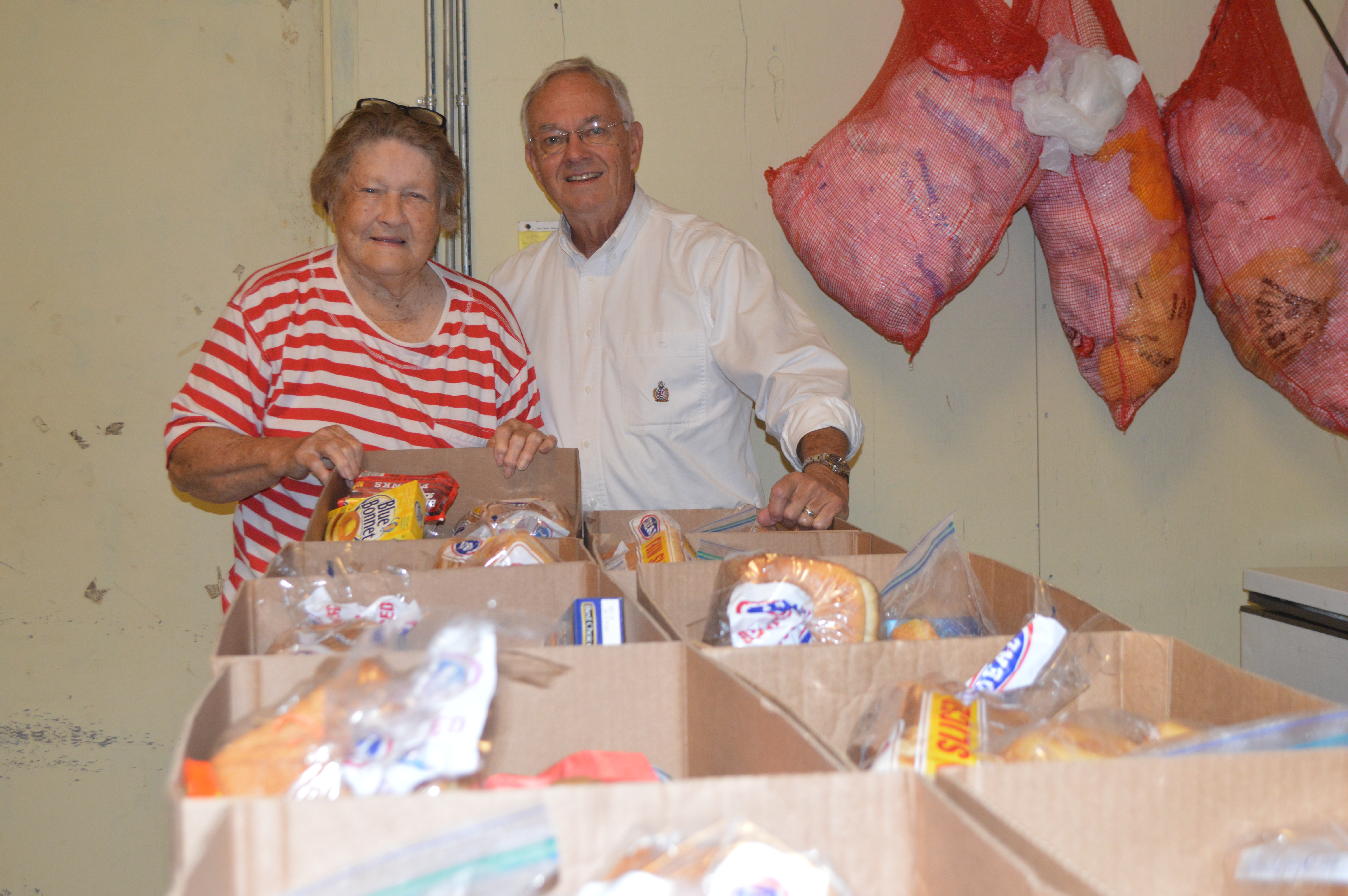 With food boxes at the Community Food Pantry are Martha McMinn, left, and Tommy Ellett.