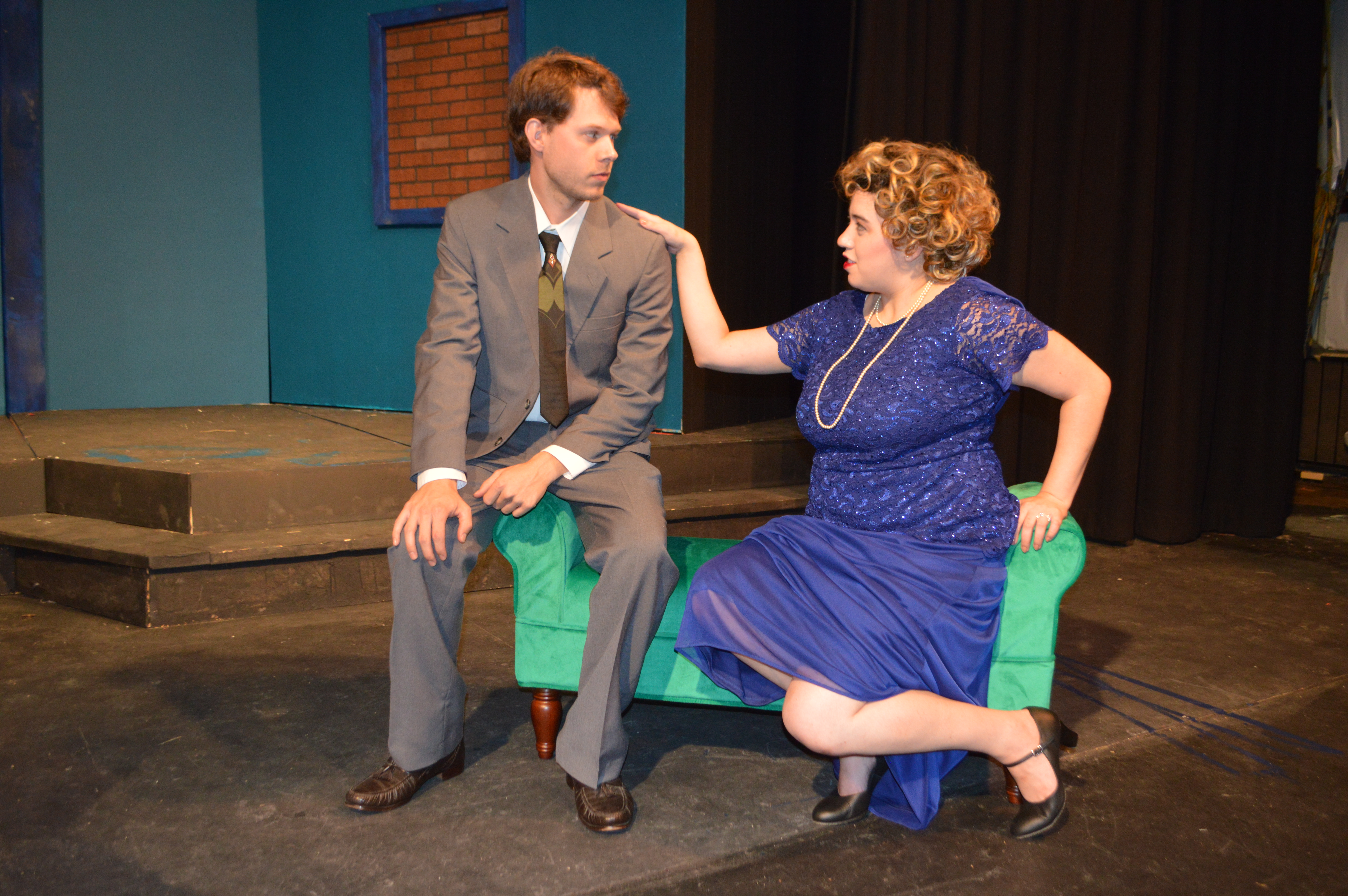 J.T. Hurst, left, and Katelin Roberts rehearse for Greenwood Little Theatre’s upcoming play “No Exit,” which opens Thursday.