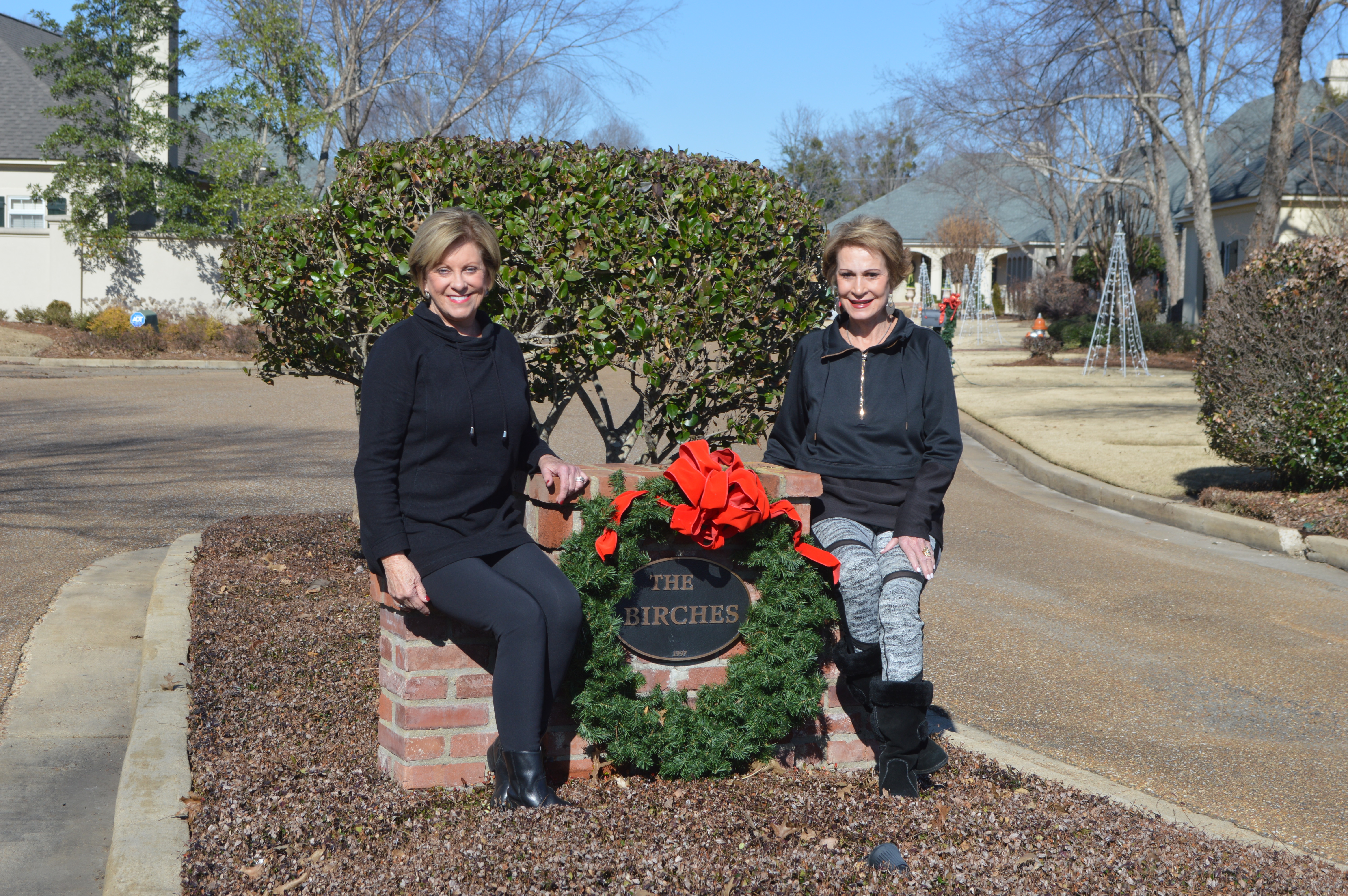 Vicki Morgan, left, president of The Birches Homeowners Association, and Patty Brock sit at the entrance of their neighborhood. For the past three years, residents of The Birches decorate each of their homes with an 8-foot metal lighted Christmas tree, which was Brock’s idea.