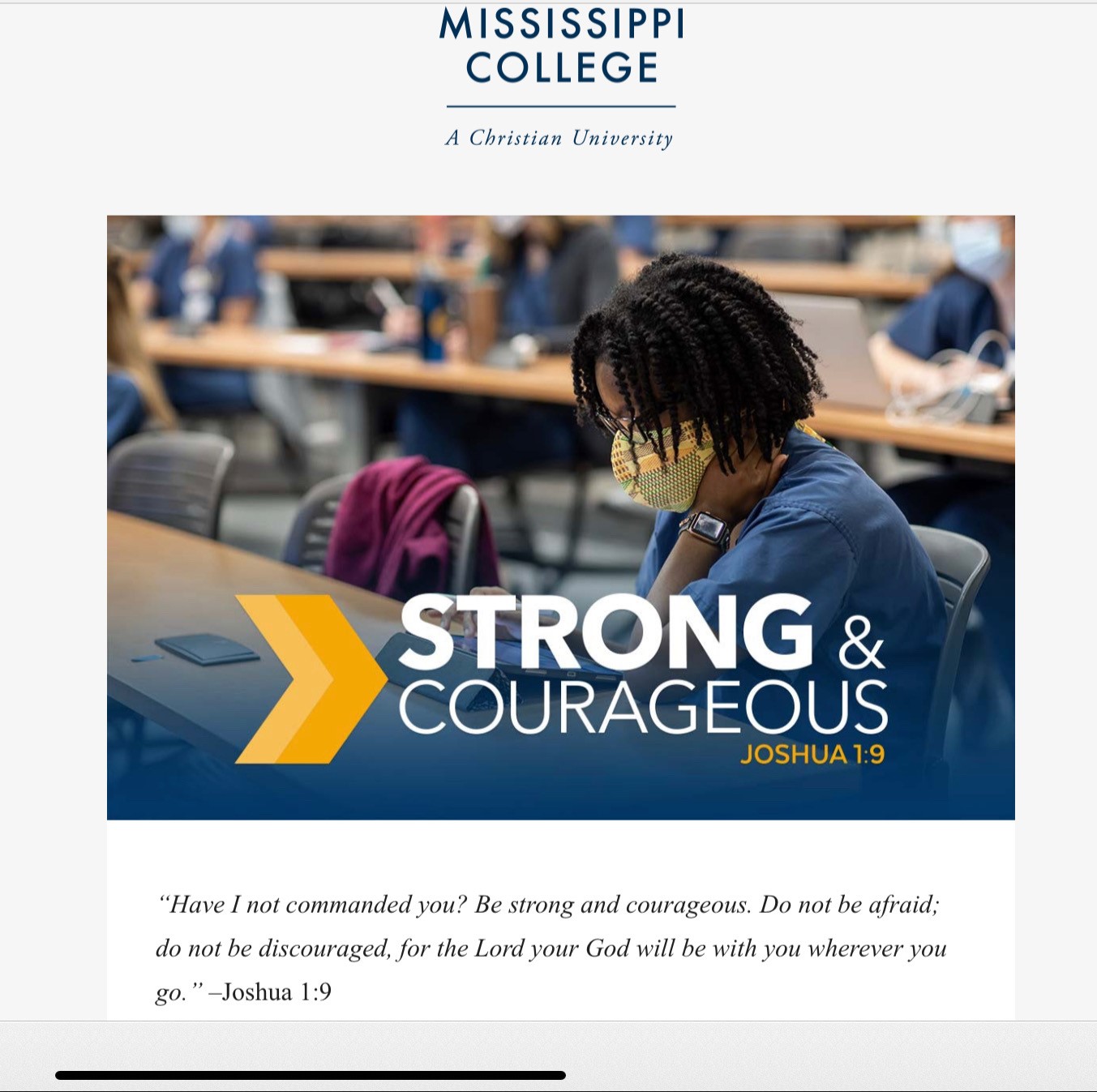 Recently, on Mississippi College’s website, there was a picture of Banks on the homepage with the words “Strong & Courageous” and the Bible verse Joshua 1:9 — “Have I not commanded you? Be strong and courageous. Do not be afraid; do not be discouraged, for the Lord your God will be with you wherever you go.”