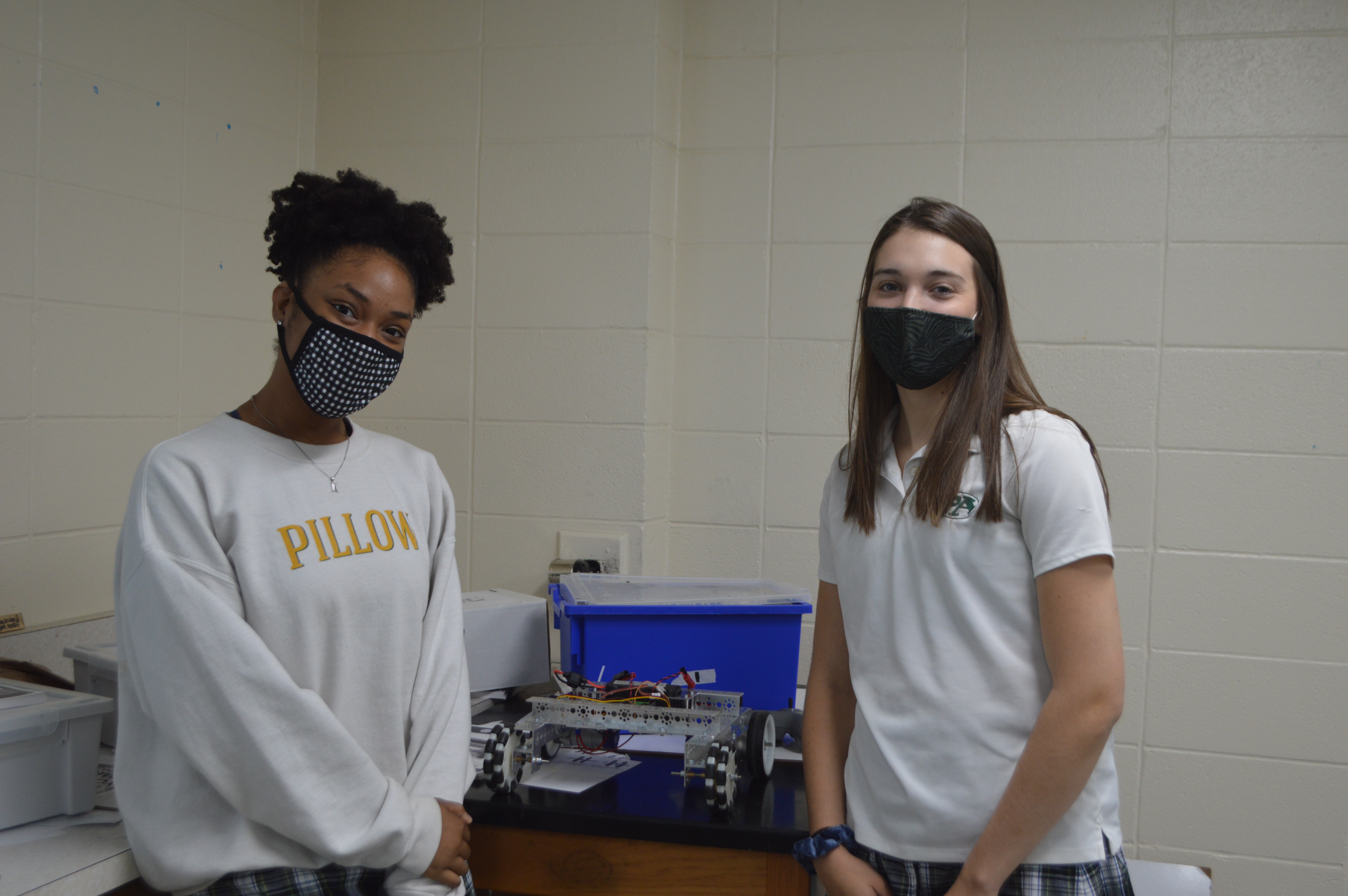 Pillow seniors Kayla Brown, left, and Kaylee Jones both said they were excited to learn that the school was offering an engineering design and robotics class this year.