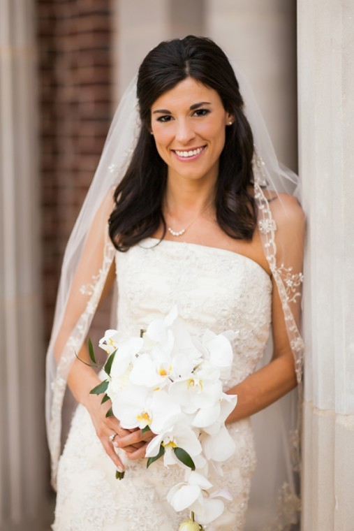 The bride carried a bouquet of white phaeleonopsis orchids hand tied with ivory lace with pearls replicating the bouquet carried by her mother in her parents’ wedding in 1980.