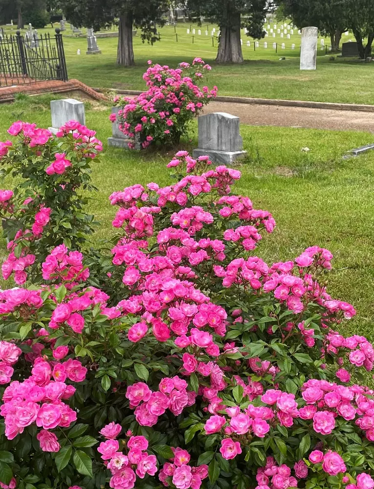 Meanwhile, there are old roses growing all over the state with little or no care. My favorite go-to site for seeing and smelling many of the best is the 1820s Greenwood Cemetery, located one block north of our state capitol in downtown Jackson. There are many dozens of shrubs representing many different kinds, nestled between tombstones where string trimmers can’t get to them. The “own root” (not grafted) beauties are repeat flowering and thrive with only occasional pruning, hit-or-miss fertilizing, no watering and no sprays yet are nearly if not completely disease free.