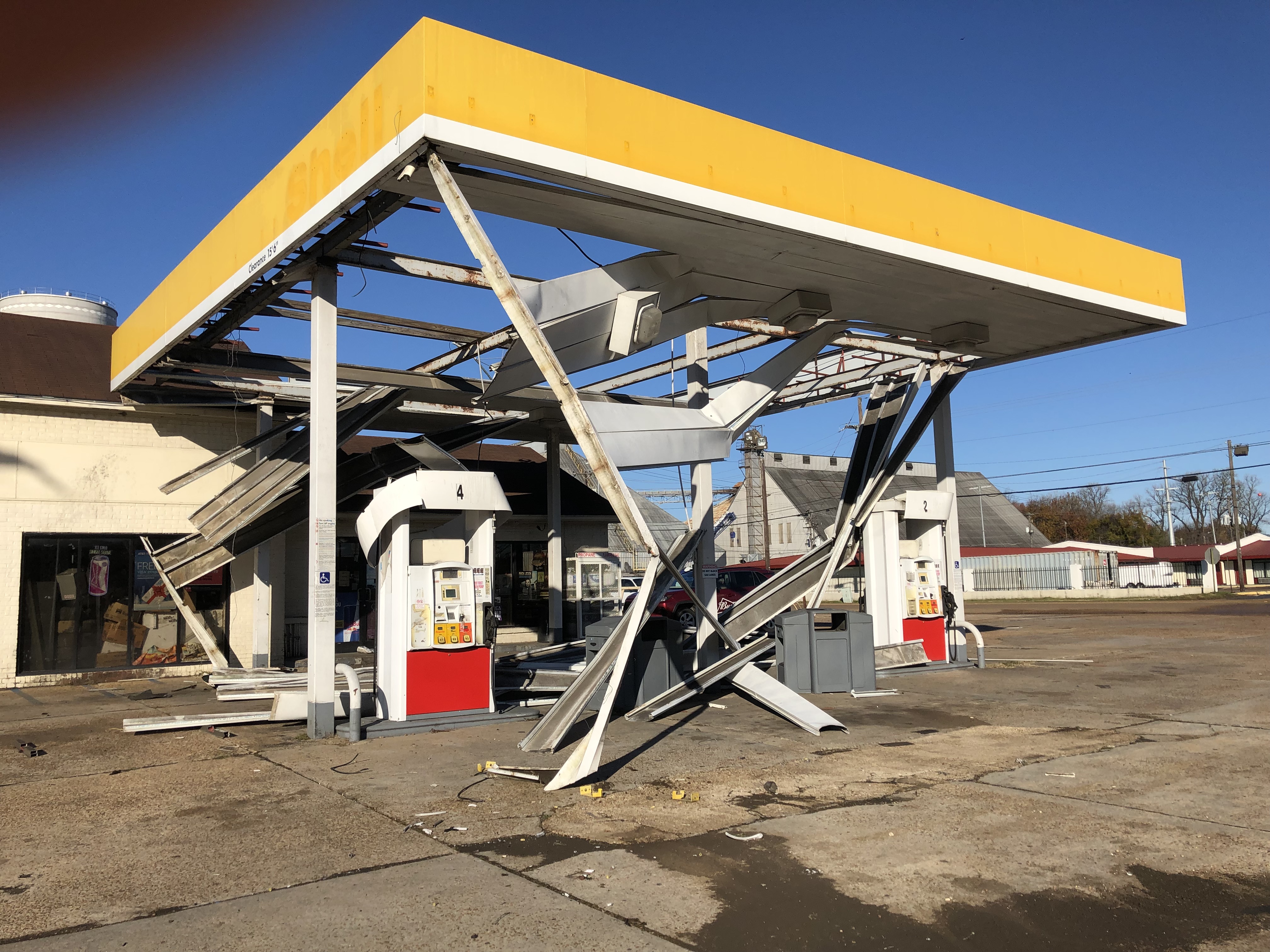 Fred Randle, the county’s emergency management director, said the only major incident was damage to the gas station on U.S. 82 near the Greenwood oil mill. The canopy over the gas station’s fuel pumps caved in, but the pumps and the building housing the convenience store remained intact.