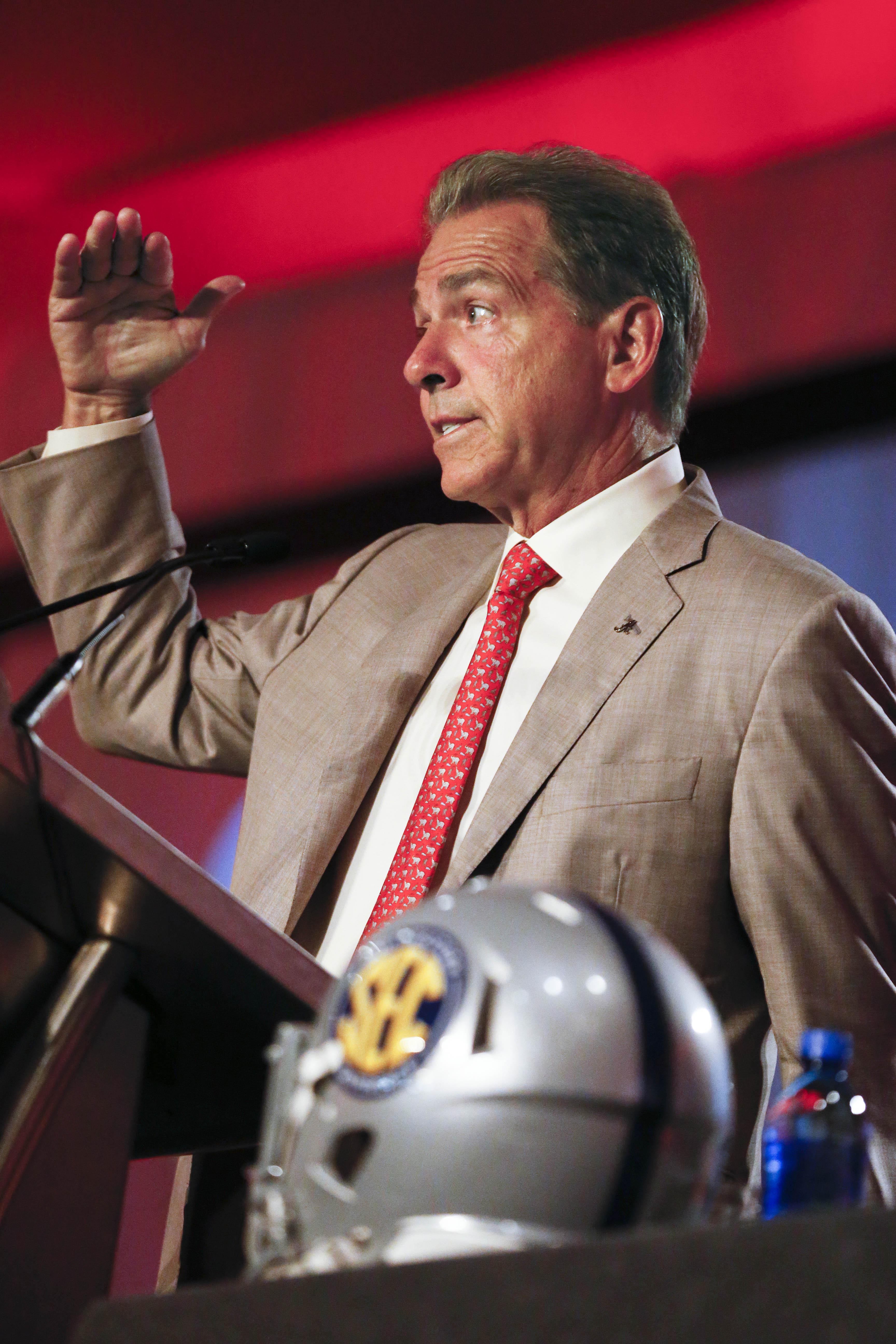 It wasn’t until Saban stepped off the podium and onto the SEC Network stage that he was challenged with a legitimate, tough question. That came from SEC pundit Paul Finebaum, who asked why there would be no suspensions for two players who were arrested and booked in Louisiana on drug and weapons charges, but who avoided prosecution when the district attorney declined to press forward with the case.