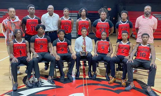 The Leflore County boys basketball team won the Region 3-2A district tournament with a 36-30 win over Northside High School Friday night. Members of the team are, front from left, Curtis Young, Caleb Day, Samford Franklin, head coach Michael Higgin, Keveon Cross, Jeremy E. Gilbert and Emoni Journey; back row, assistant coach Jeremy P. Gilbert, Tavarus Addison, assistant coach George Davenport, Terrance Williams, Eric Cooper, Maurice Edwards, Tyler Davis and assistant coach Tavarus Gideon. The Tigers played host to Water Valley in the first round of the North 2A Tournament Tuesday night. (By Calvin Stevens, Copyright 2025 Emmerich Newspapers, Inc.)