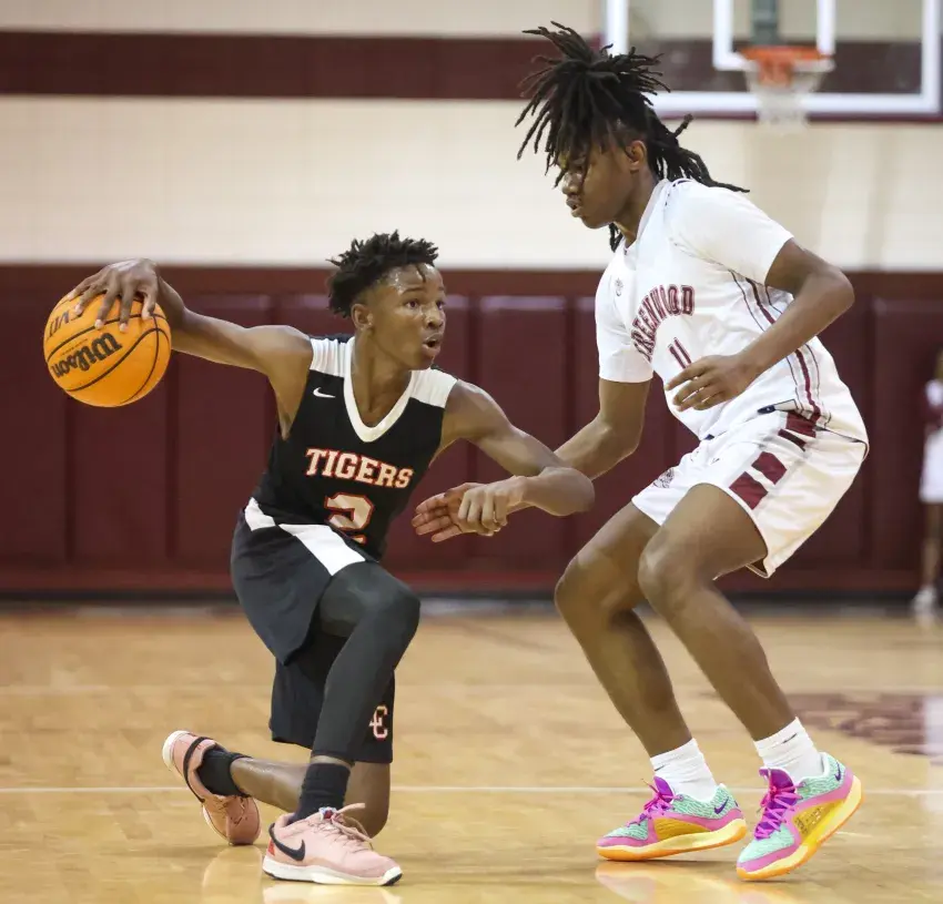 Leflore County’s Terrance Williams, left, dribbles the ball while being guarded by Greenwood High School’s Amaree Russell, right, during the Tigers' 56-45 win on Wednesday. Leflore County’s Lady Tigers also earned a 31-18 victory over Greenwood’s Lady Bulldogs to begin the 2024-2025 season. (By Andy Lo, Copyright 2024 Emmerich Newspapers, Inc)