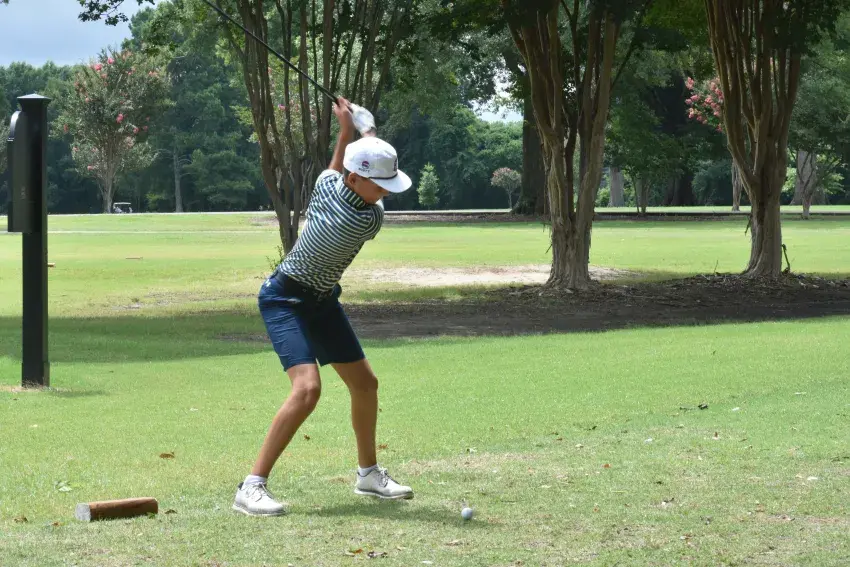 Young golfers hit the links at the Greenwood Country Club Thursday for the second round of the Mississippi Junior Golf Association Junior Invitational. At the top, lefty Branton Brown fires a tee shot on No. 12. Brown shot a 78 in the first round in the Boys 12-13 Division. (By Jeff Byrd, Copyright 2024 Emmerich Newspapers, Inc.)
