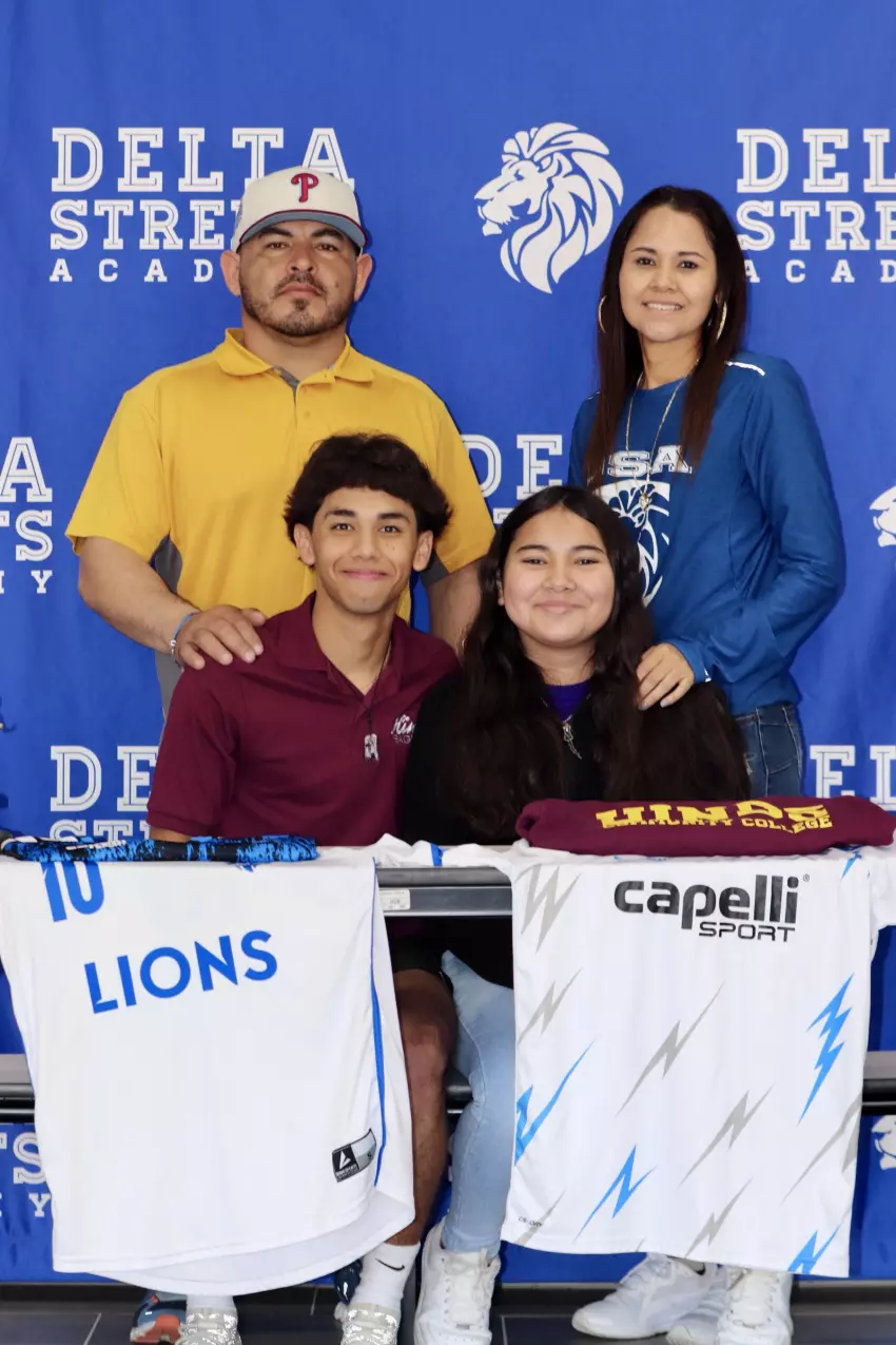 Delta Streets Academy’s Danny Vargas, seated left, signed a national letter of intent with Hinds Community College to play soccer for the Eagles. At the signing ceremony Monday with Vargas are his sister, Vanessa Duron, seated; and Jose Duron, back left, stepfather, and Diana Vargas, mother. (By Autumn McCaleb, Copyright 2024, Emmerich Newspapers, Inc)