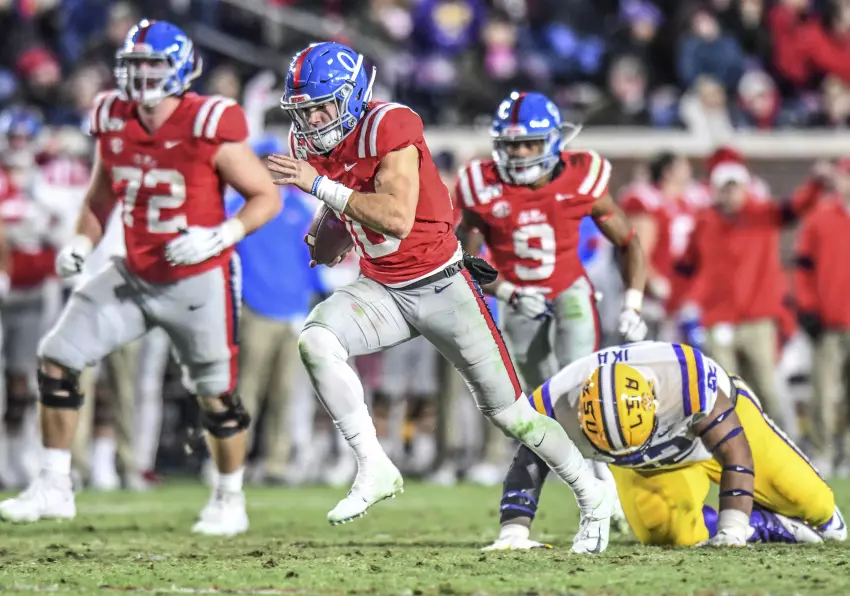 APOle Miss wide receiver Elijah Moore (8) is consoled by Ashley Luke, wife of Ole Miss head coach Matt Luke, following a loss to Mississippi State. Moore was penalized for celebrating a touchdown by crawling and pretending to urinate like a dog, and that led to a missed extra point that would have sent the game into overtime.