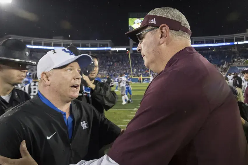 Kentucky coach Mark Stoops, left, meets Mississippi State coach Joe Moorhead at midfield after the Wildcats defeated the Bulldogs 28-7 in Lexington, Ky., last Saturday. The Bulldogs were called for 16 penalties, including multiple false starts and unsportsmanlike conducts.