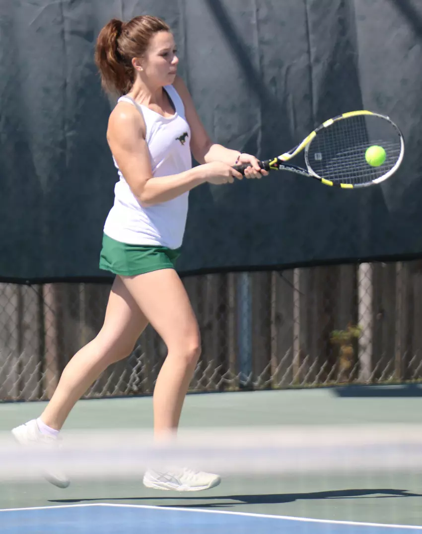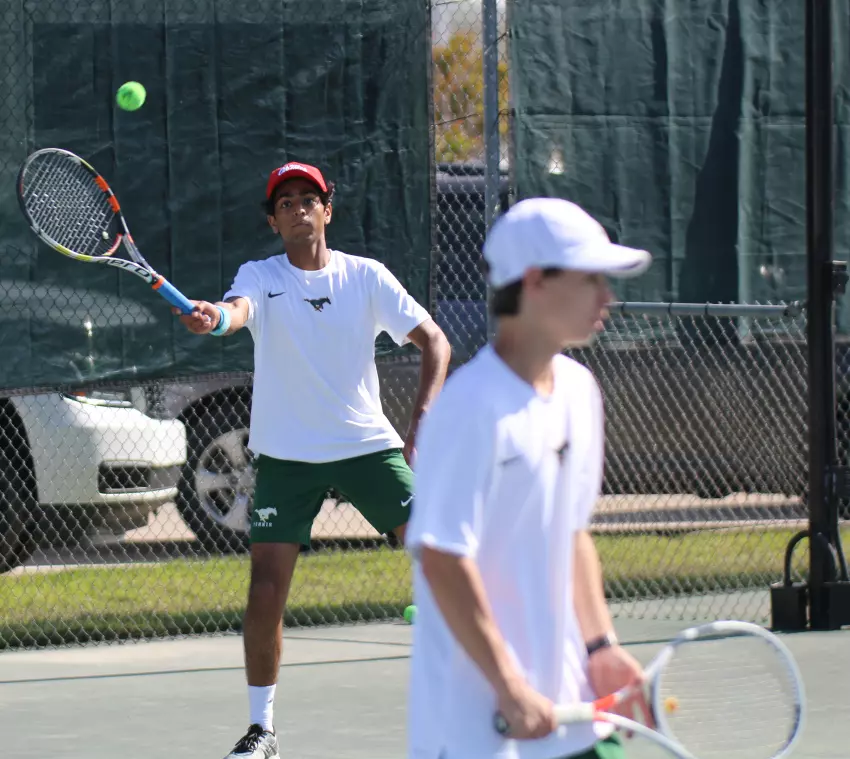 Pillow Academy junior Sunjay Chawla, left, returns a serve as partner Brady McDaniel, a senior, stands in the foreground during their No. 1 boys doubles contest Thursday in Greenwood against Jackson Academy. The duo, which has played exclusively singles for the previous six years, combined for the first and final time in their 6-2, 6-2 victory over JA’s top tandem of James McLemore and Steven Chustz.