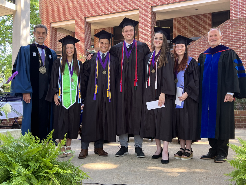 Left to right: Dr. Robert W. Pearigen, president of Millsaps College; Taylor Kay Weintritt; Paul Starnes Thomas; Newlon Bryce Gillihan; Mary Frances Dickie; Anna Grace Boxx; Dr. Keith Dunn, provost and dean of Millsaps College. Photo credit: Greg Campbell