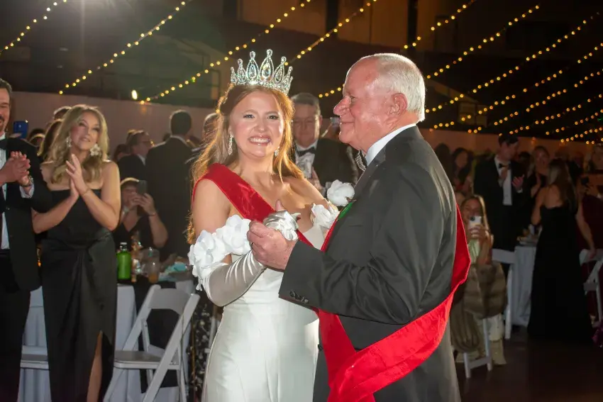 The crowd at the 69th annual Junior Auxiliary Charity Cotton Ball enjoys watching the newly crowned Queen Rachel Singleton, left, and King Ronnie Moss during the evening’s first dance following their coronation at the Andrew McQueen Jr. Civic Center Saturday night. The Auxiliary holds the ball each year as its fundraiser for programs benefiting children in the community. The new King and Queen will be highlighted in the Commonwealth’s weekend edition.
