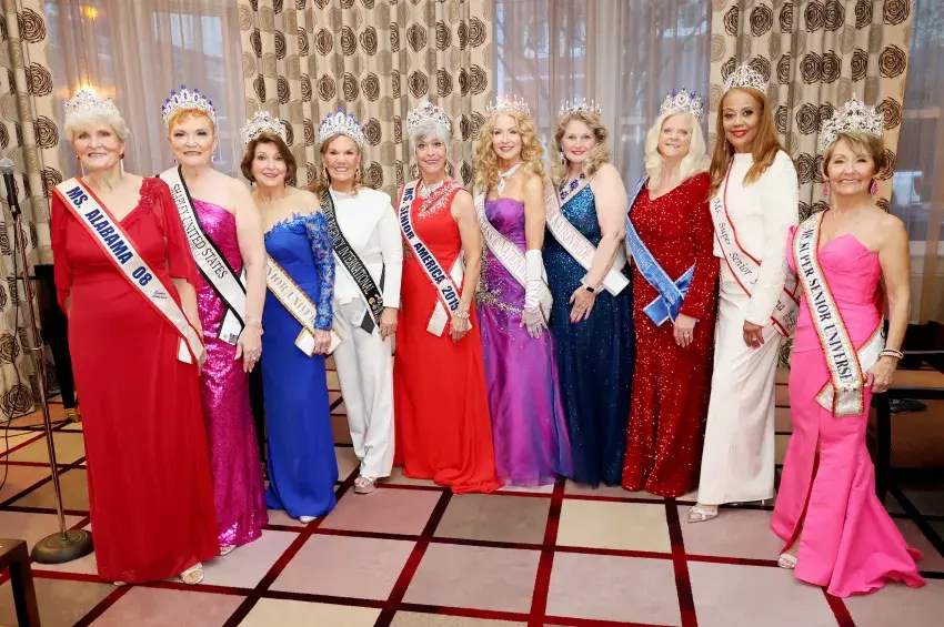 Senior pageant queens will visit Greenwood later this week. From left are Edwina Chappel of Alabama, Robyn Clark of Texas, Sally Beth Vick of Alabama, Eva Susie Pospisil of Texas, Dr. Barbara Mauldin of Mississippi, Aileen Brady of Texas, Kellie Gragg of Alabam, Becky Grohman of Florida, Pauline Vaughn-Murphy of Alabama and Betty Aden of Mississippi.