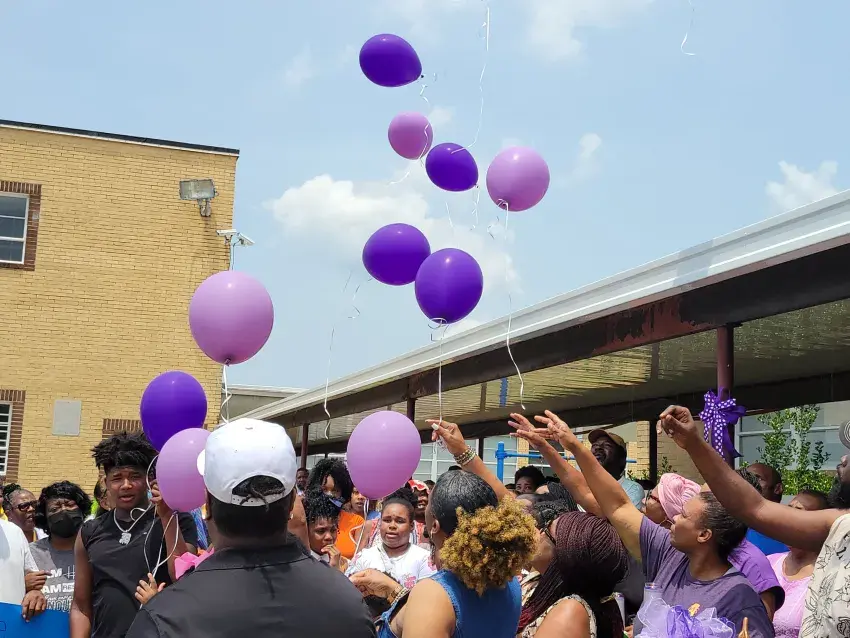 Family members release 10 balloons to the sky Wednesday afternoon at Threadgill Elementary School during a vigil in honor of Zameria Jones, a 10-year-old Threadgill student who was shot on Memorial Day and died June 5. (By Kevin Edwards,, Copyright 2025 Emmerich Newspapers, Inc.)
