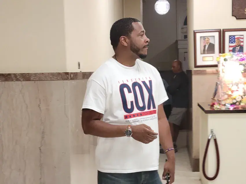 Kenderick Cox, a Democratic candidate for mayor, awaits election results Tuesday at the Leflore County Courthouse. In back is Lamar Liddell, who will face Cox in a runoff April 22. (By Kevin Edwards, Copyright 2025 Emmerich Newspapers, Inc.)