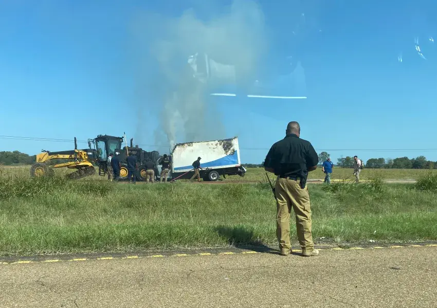 Emergency personnel respond to a wreck west of Itta Bena that resulted in a man’s death Wednesday morning. Leflore County Coroner Debra Sanders said the driver of the truck, pictured on the right, slammed into the back of the road grader. The truck burst into flames, and the man, tentatively identified as Raymond Thornburg, was unable to escape. (Photo by Anne Miles, Copyright 2024 Emmerich Newspapers, Inc.)