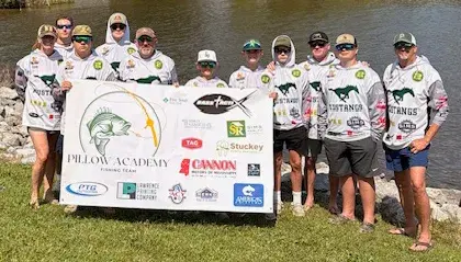 The Pillow Academy fishing team just completed the regular season of its schedule at an event at the Ross Barnett Reservoir last weekend. They had five boats in the water, which had students and volunteer coaches in each. The team will now compete in the Mississippi State Championships on May 16 at Ross Barnett. Members of the team are, front from left, Brooke Baugh (coach & captain), Hodges Valente, Tom Baugh (captain), Landon Atkinson, Jack Sims, Schaefer Hodges, Heath Hodges (captain), Reeves Jordan, Jackie Sims (captain), back row, Charlie Dunn and Aiden Valente. Not pictured are Nicholas O’Neal (captain) and Jack O’Neal. The team competed in five tournaments in the regular season.