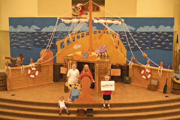 The set, which fits the “High Seas” theme of the Bible school, is an elaborate styrofoam-based recreation of a wooden pirate ship cut, formed, burned and painted by members of the church.