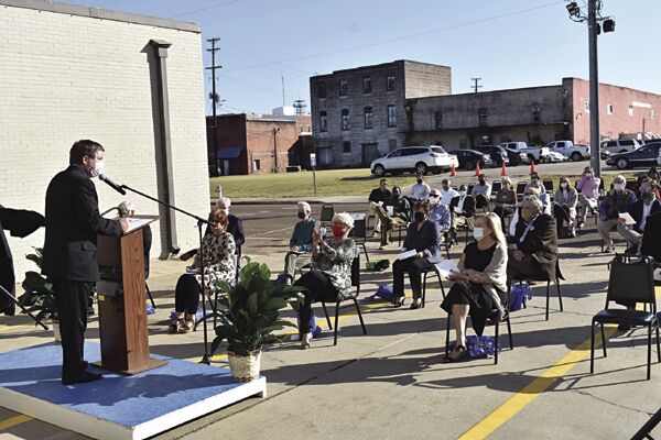 Brian Finnegan, left, CEO of Greenwood Utilities, addresses the audience Monday at an event to celebrate the 125th anniversary of the dawn of electricity in the city.
