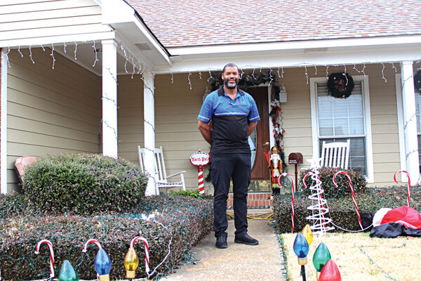 Greenwood resident Moyo Brown stands in front of his house on North Park Drive, which he took the time to decorate with Christmas lights and other decorations as a means to cheer people amid the COVID-19 pandemic.