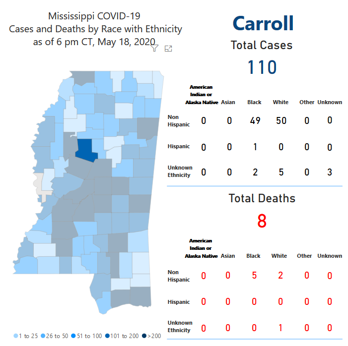 No new deaths were reported for Leflore County, where 22 have died from the virus. Its last death to be reported occurred on May 13.