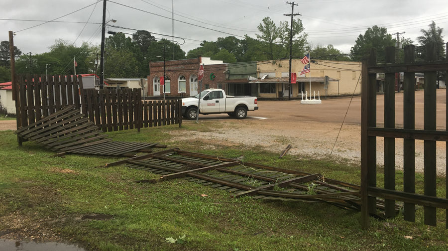 A portion of the fence of the Carrollton/North Carrollton Volunteer Fire Department is damaged following severe storms that swept through Sunday night.