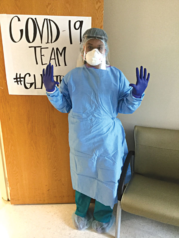 A COVID-19 nurse at Greenwood Leflore Hospital demonstrates proper wearing of personal protective equipment. The face shield she is wearing was made by Mike Cardillo, John Willhite and Jan Roberson from a 3D printer.