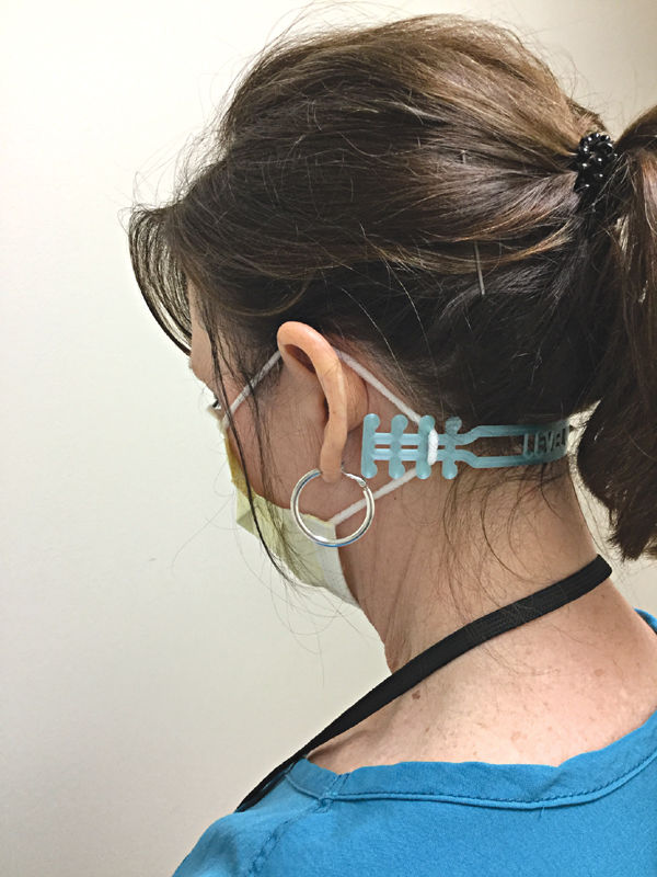A screening-coordinator nurse wears a mask strap made by Mike Cardillo, John Willhite and Jan Roberson.