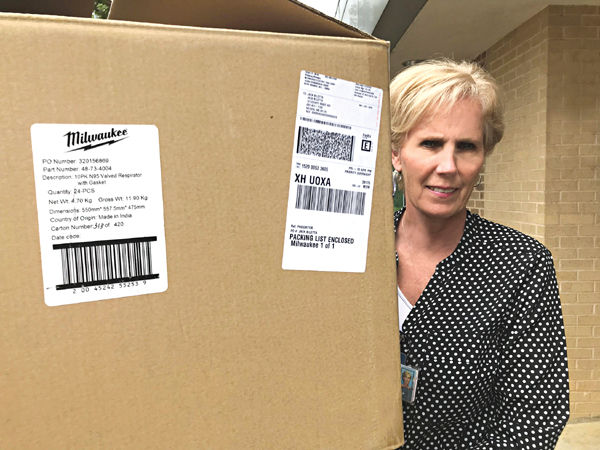 Key Britt, vice president of administrative services for Greenwood Leflore Hospital, holds a box of masks donated by Milwaukee Tool.