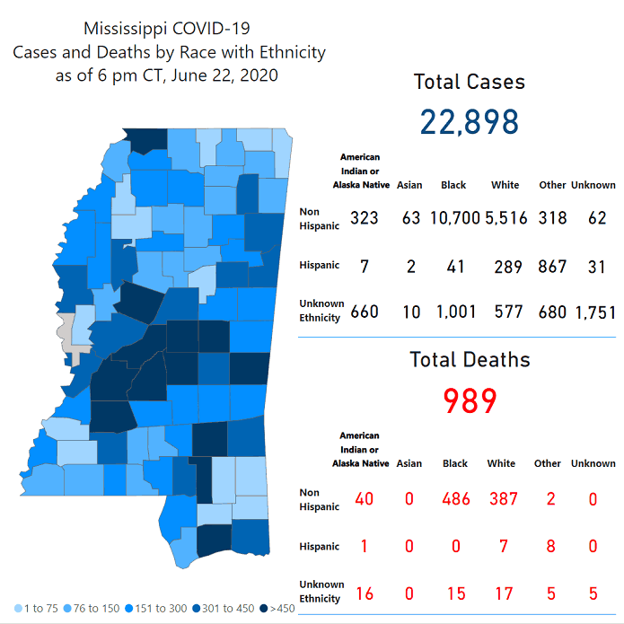 Mississippi's COVID-19 cases and deaths as of June 22, 2020