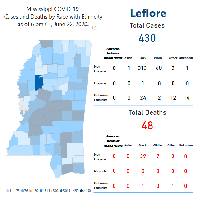 The woman was Black, as were 38 others to die of COVID-19 in Leflore County. Black residents account for 81% of the county’s deaths from the virus.