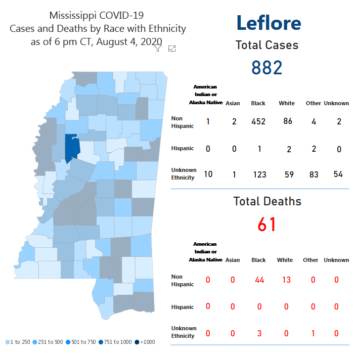 Blacks have accounted for 47, or 77%, of the COVID-19 fatalities in Leflore County, nearly mirroring the county’s estimated Black population of 75%.