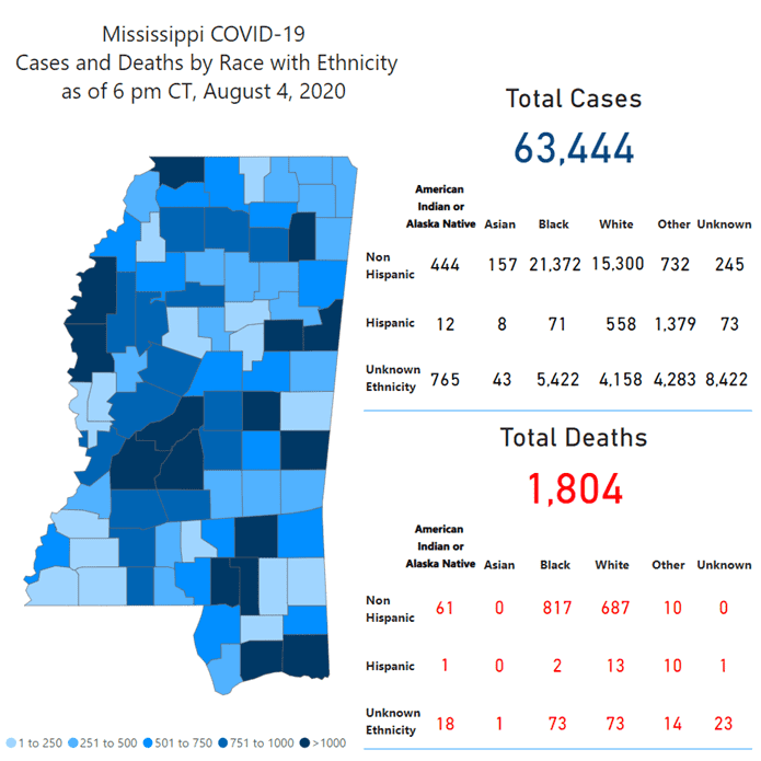 Mississippi's COVID-19 cases and deaths as of Aug. 4, 2020