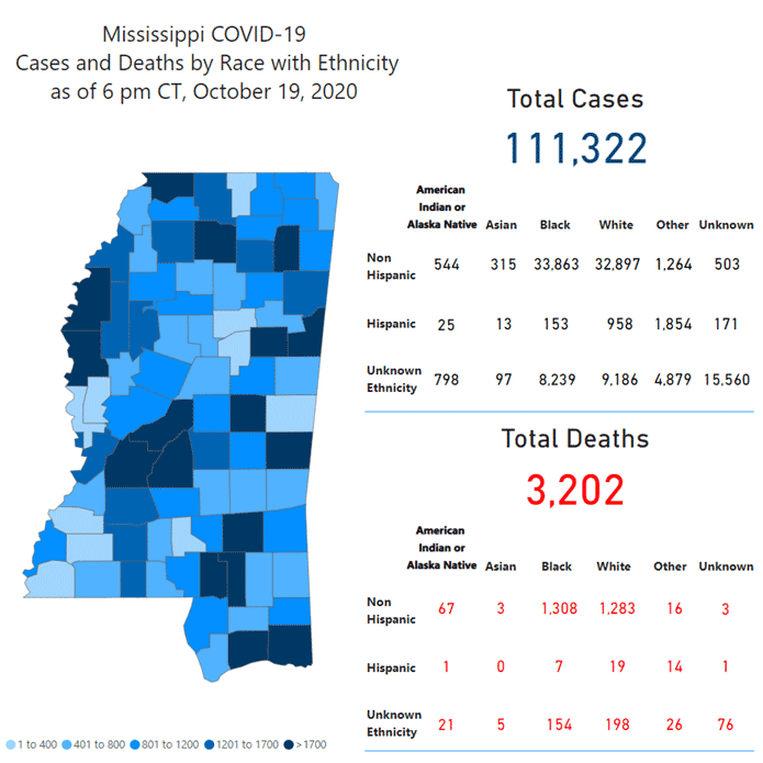 Mississippi's COVID-19 cases and deaths as of Oct. 19, 2020
