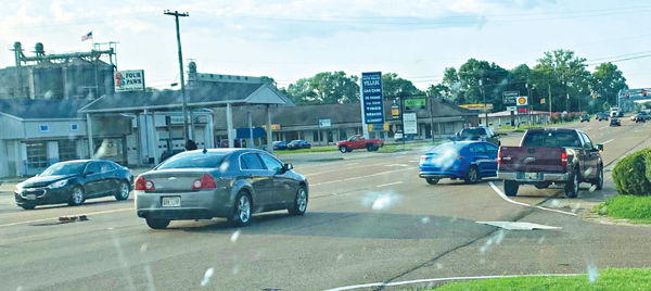 The incident happened about 6:45 p.m. in the left lane of the westbound side of U.S. 82, at the intersection with Yazoo Avenue, in front of the Shell Rapid Lube shop. The manhole cover is in the roadway itself, in line with the Shell sign, and is not slotted as a drain would be, indicating it could be an access point to underground utilities.