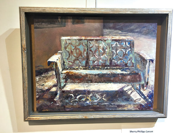Several interpretations of familiar Delta scenes are represented, including Elke Briuer’s impressionistic “Delta Trees,” Sherry Phillips Carson’s “Old Rusty Glider,” and John Armistead’s “Haven of Rest.”