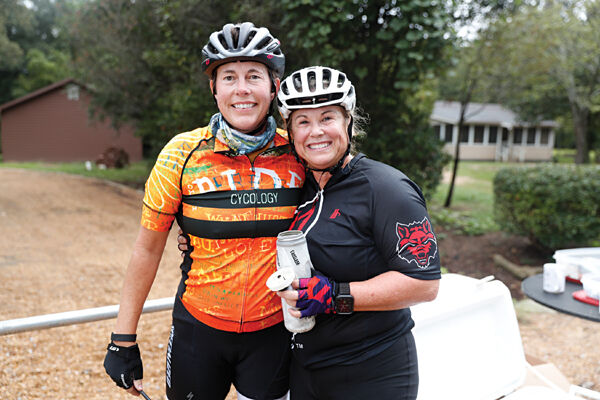 Timber Keys, left, and Rhonda Qualls enjoy themselves at a rest stop during Saturday’s Greenwood Gravel Grind.