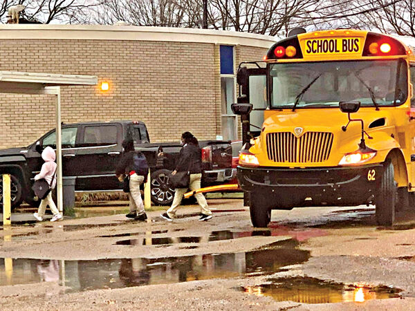 Wearing masks, East Elementary School students depart the bus Monday for their first day back for face-to-face learning.